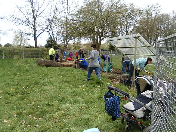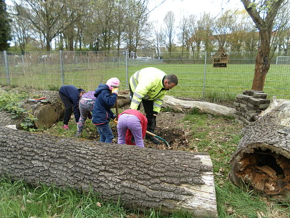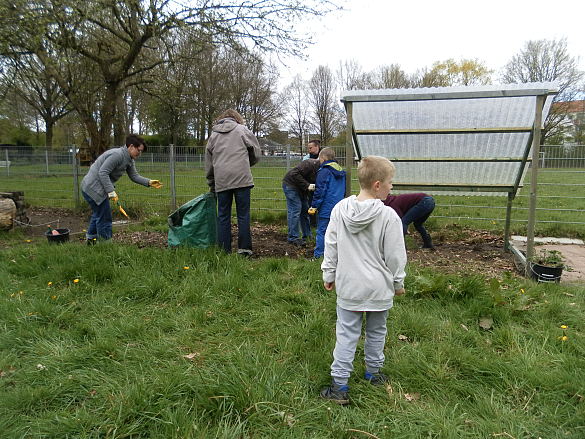 Am Samstag, den 23.4. fand in unserem Schulgarten ein Gartenaktionstag statt. Tatkräftig packen 17 Kindern, 14 Eltern, Frau Grewe, Frau Wodtke und Frau Ehrhorn mit an und bereiteten unseren Schulgarten auf das kommende Gartenjahr vor: Es wurde der Kartoffelacker umgegraben, der Rasen gemäht, das Erdbeerfeld, der Tomatenunterstand und das Tipi gesäubert. Außerdem wurde die Feuerstelle in Schuss gebracht, der Zaun von Pflanzenresten entfernt, die Hecke beschnitten und zu guter Letzt wilde Brombeeren ausgegraben.